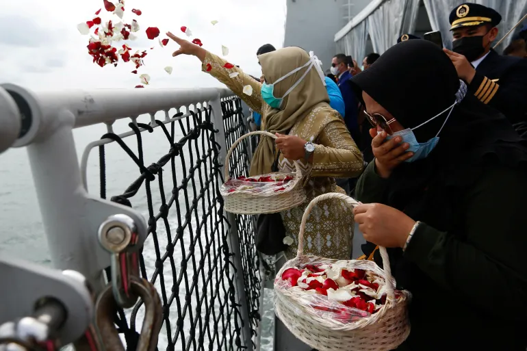 Family members pay their respects and scatter petals at the spot where Sriwijaya Air flight SJ182 crashed into the sea last month [File: Ajeng Dinar Ulfiana/Reuters]