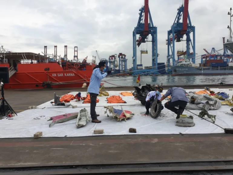 Investigators inspect the wreckage of SJ182 recovered from the Java Sea [Jessica Washington/Al Jazeera]