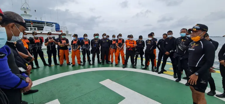 A briefing for the SJ182 search and rescue team on the Java Sea. Diver Bayu Wardoyo says conditions were ‘quite murky with thick mud’ [Courtesy of Indonesia Diving Rescue Team]