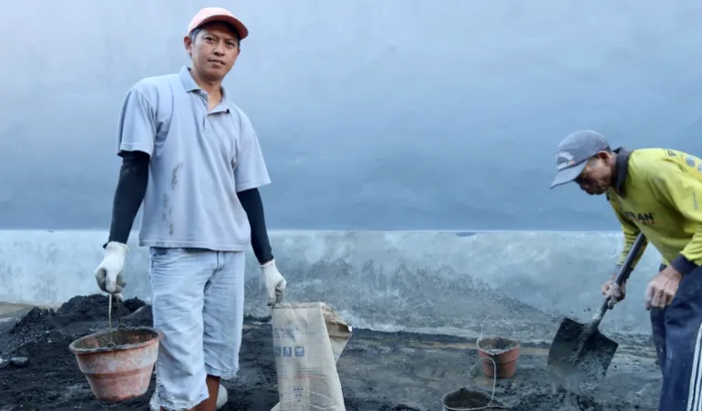 Komang Suarmika, a guide for more than 17 years, is working on a construction site.