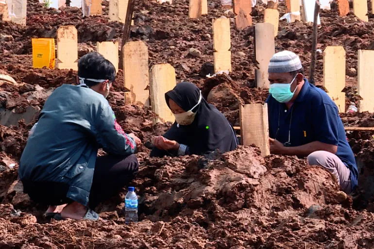 As Indonesia’s most populous island deals with its largest surge in COVID-19, families say goodbye to their loved ones in makeshift cemeteries.